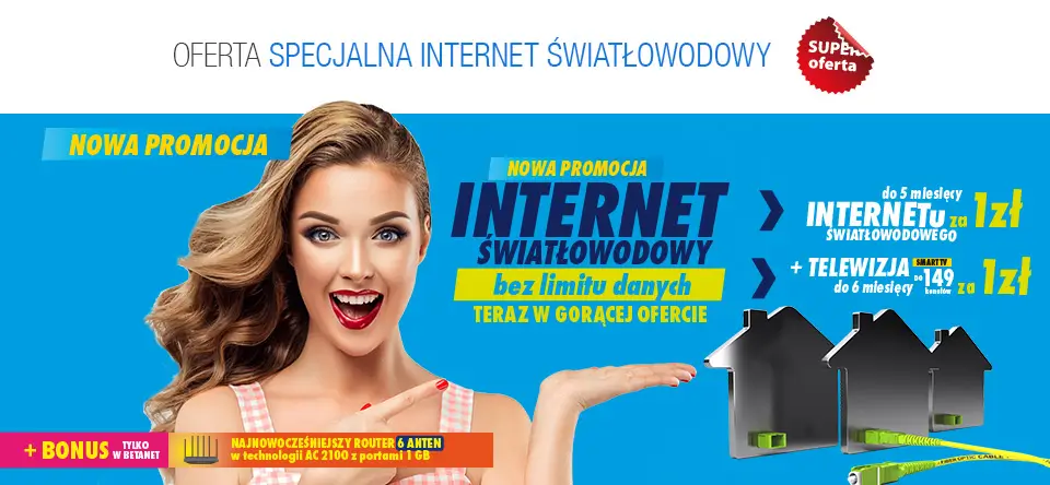 Mamy nadzieję że budowa światłowodu pozwoli Państwu cieszyć się Najszybszym Internetem Światłowodowym z najnowszym routerem 6 antenowym w technologi AC 2100 do 1 Gb do 5 miesięcy za 1 zł i telewizją Smart do 149 kanałów do 6 miesięcy za 1zł.(promocja od 1.12.2020)